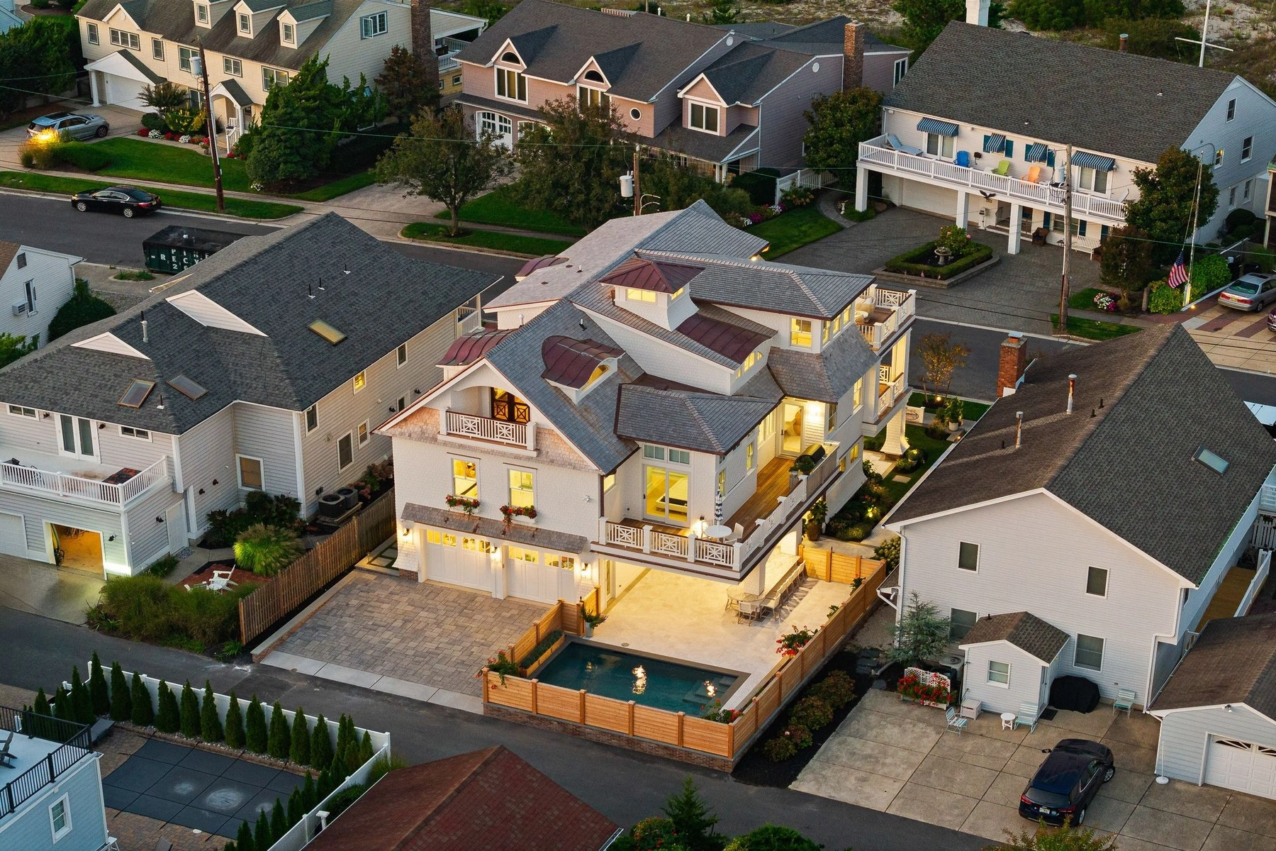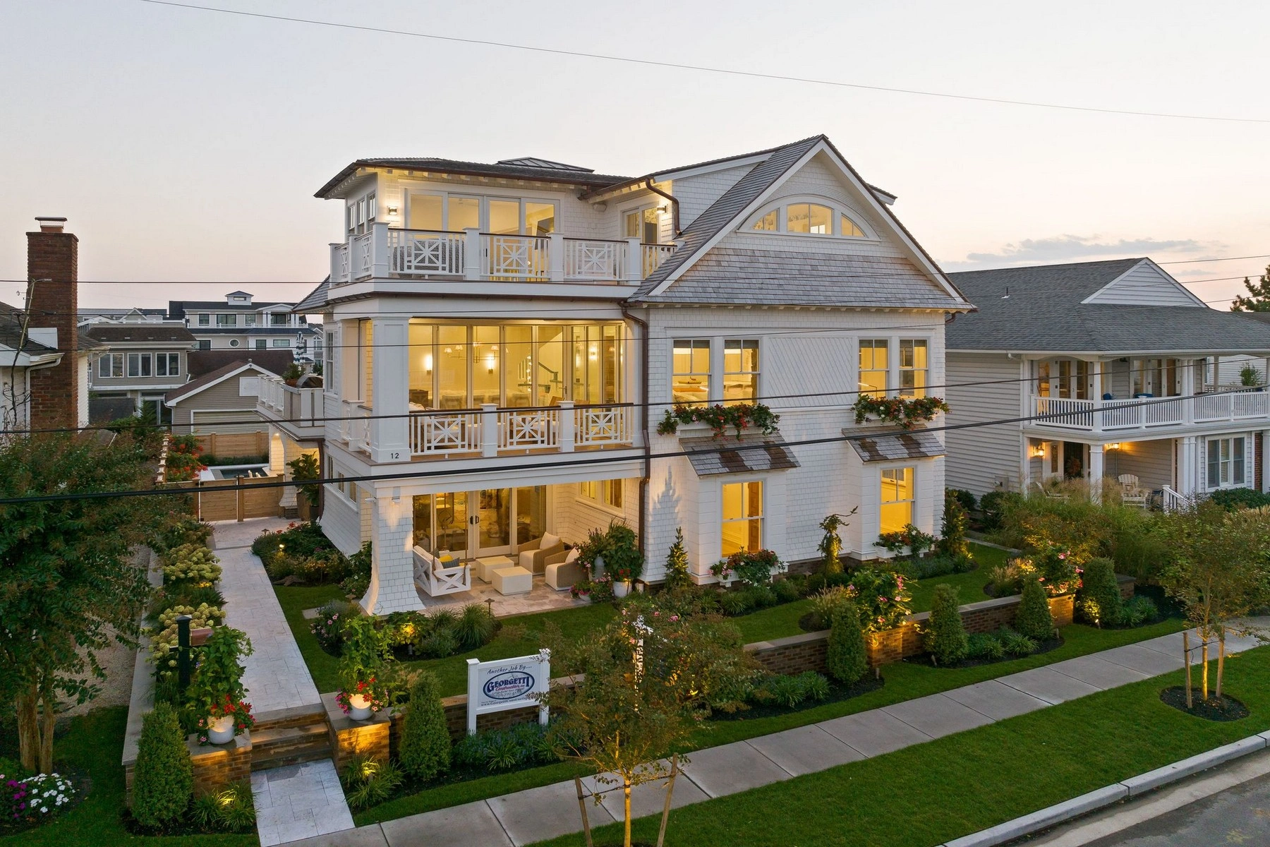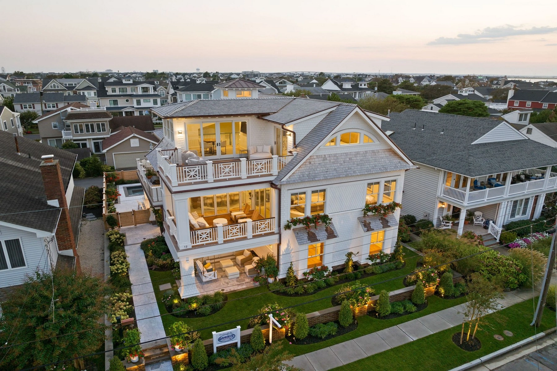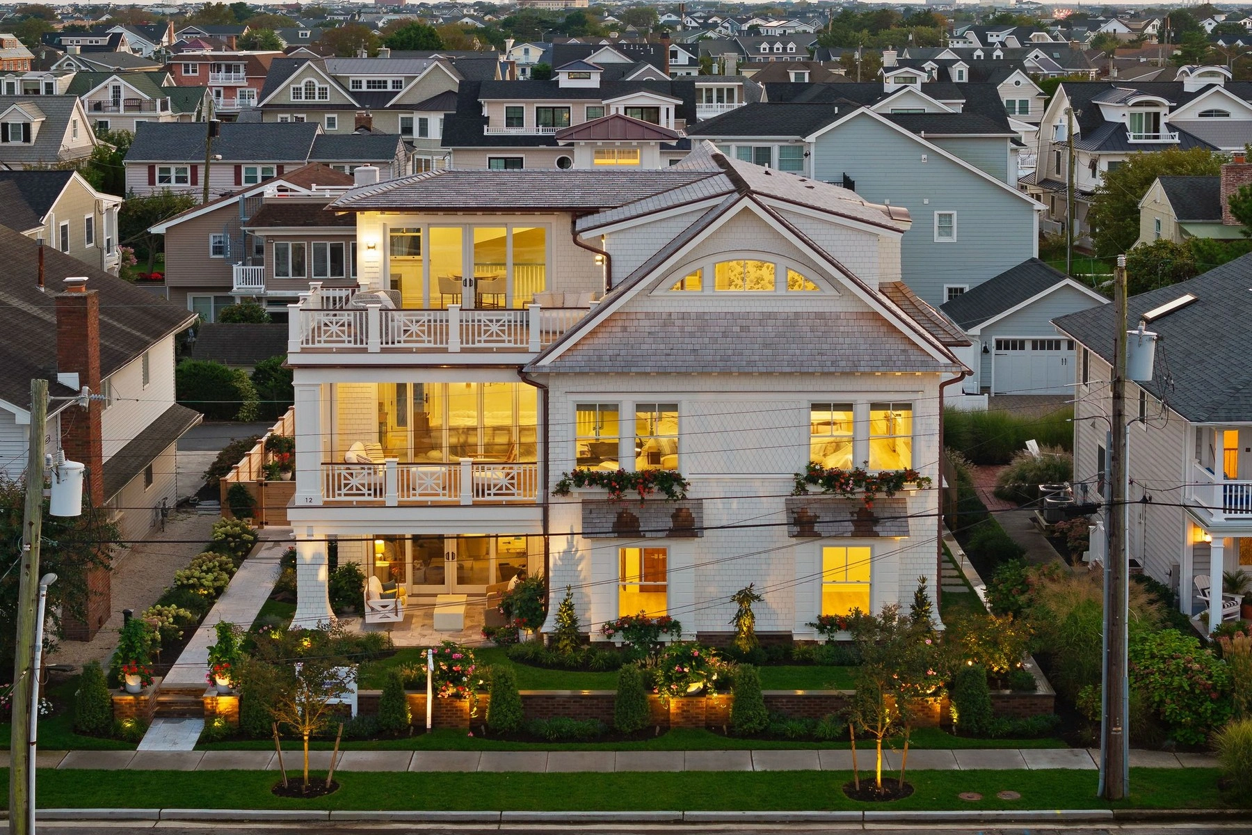 Welcome to Casa al Mare, a bespoke single-family coastal sanctuary in Ocean City’s prestigious Gardens neighborhood custom built by Georgetti Construction. Positioned directly across the street from the beach, this residence captures sweeping ocean views while showcasing architectural pedigree, cutting-edge technology, and timeless Shore style. Masterfully built, the home sits on a 59’ × 92’ lot at one of the highest elevations in Ocean City, offering nearly 4,000 sq. ft. of finished living space with multiple outdoor entertaining areas across three levels, 5 bedrooms, 6.5 bathrooms, and the convenience of an elevator. As you approach the entrance, a custom mahogany front door opens to a grand foyer with a sweeping staircase, complete with a custom stair runner and designer lighting—setting the tone for the home’s sophisticated design. The first level also includes a separate living area, two ensuite bedrooms, and a cabana bath. On the main level, the open great room impresses with a living and dining area flowing into a gourmet kitchen with Bluebell cabinetry, a Macchia Vecchia marble-wrapped hood and waterfall island, and a SubZero/Wolf appliance package. Expansive NanaWall glass doors create seamless indoor-outdoor living and frame ocean views, with Bromic heaters allowing year-round enjoyment. The dining area features custom cabinetry and an oyster accent wall that extends to a balcony with a built-in grill overlooking the rear yard. This level also offers a powder room, a laundry room with sink and custom cabinetry, and two ensuite bedrooms, including a custom bunk room. The top floor is dedicated to the private primary suite, offering a serene seating area and bedroom—both opening to a balcony with panoramic water views. The suite includes a custom walk-in closet and spa-style bathroom with dual vanities, a makeup counter, soaking tub, glass-enclosed rain shower, and heated toilet. Completing the retreat is a screened sleeping porch designed for breezy summer nights. High-end finishes include Andersen A-Series windows, white oak wide plank hardwood floors, radiant heating throughout the ground level and primary bathroom, walk-in closets, custom-tiled baths, and a holographic fireplace. Smart home integration features Lutron, Control4, Sonos, and full interior/exterior security. The exterior showcases Maibec cedar siding, an Alaskan red cedar roof with copper accents, ½ round copper gutters, Marmiro stone hardscaping, and lush landscaping with custom flower boxes, planters, and lighting. Outdoor living is elevated with a bar and entertaining area featuring Naturekast cabinetry, Bromic heaters, and an outdoor TV, all overlooking the 10’ × 20’ heated gunite saltwater pool with fountains. The two-car garage is outfitted with a sink, washer/dryer, ice maker, vehicle charging station, and custom storage—ideal for a luxury beach lifestyle. Casa al Mare is more than a home—it’s a statement of design and craftsmanship in one of Ocean City’s most sought-after neighborhoods. Offered as new construction, designed and furnished by Associated Design Studio for turnkey luxury living at the beach.