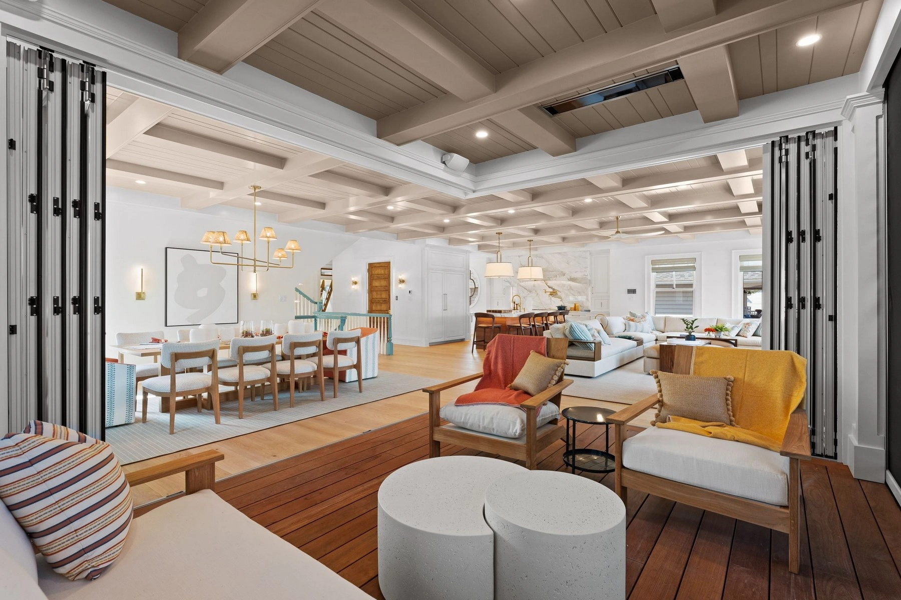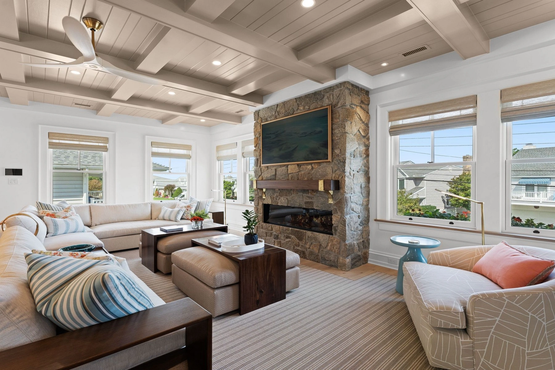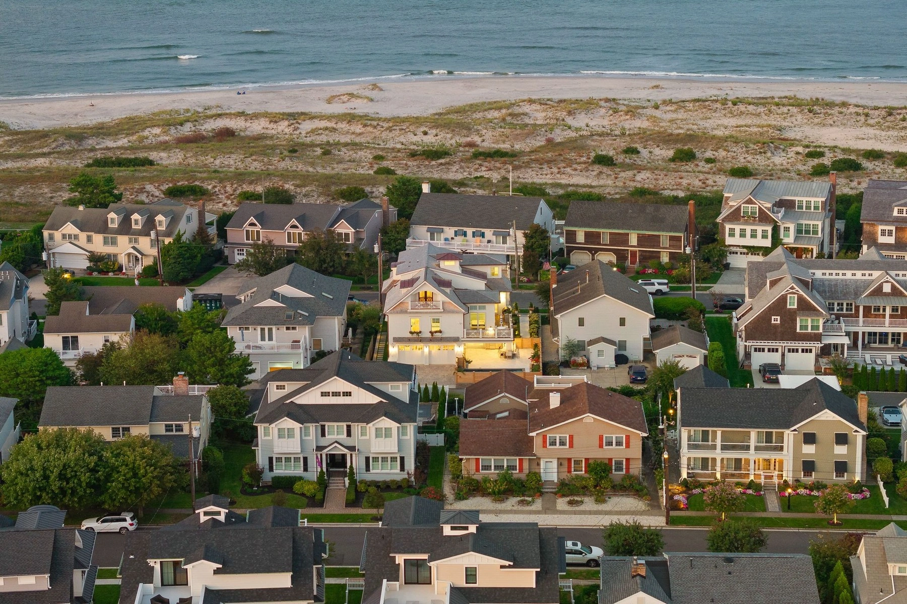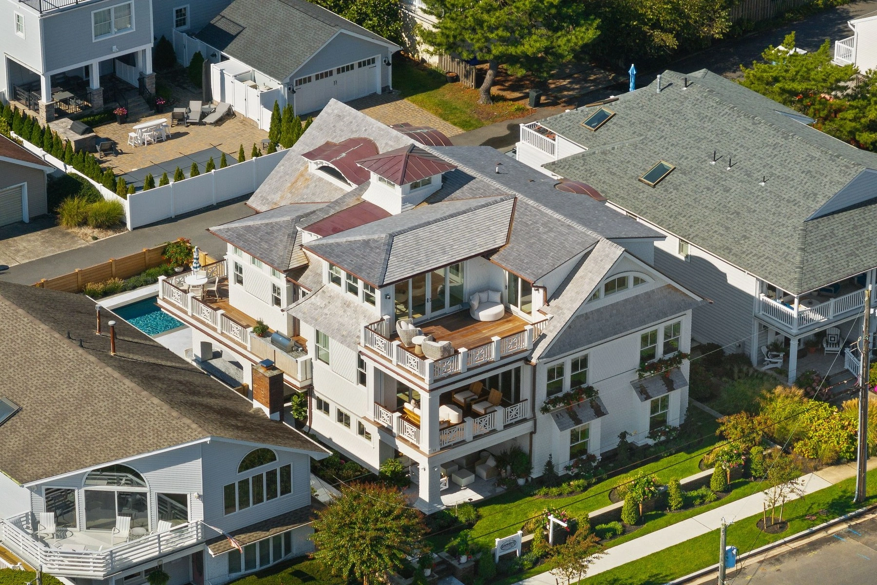 Welcome to Casa al Mare, a bespoke single-family coastal sanctuary in Ocean City’s prestigious Gardens neighborhood custom built by Georgetti Construction. Positioned directly across the street from the beach, this residence captures sweeping ocean views while showcasing architectural pedigree, cutting-edge technology, and timeless Shore style. Masterfully built, the home sits on a 59’ × 92’ lot at one of the highest elevations in Ocean City, offering nearly 4,000 sq. ft. of finished living space with multiple outdoor entertaining areas across three levels, 5 bedrooms, 6.5 bathrooms, and the convenience of an elevator. As you approach the entrance, a custom mahogany front door opens to a grand foyer with a sweeping staircase, complete with a custom stair runner and designer lighting—setting the tone for the home’s sophisticated design. The first level also includes a separate living area, two ensuite bedrooms, and a cabana bath. On the main level, the open great room impresses with a living and dining area flowing into a gourmet kitchen with Bluebell cabinetry, a Macchia Vecchia marble-wrapped hood and waterfall island, and a SubZero/Wolf appliance package. Expansive NanaWall glass doors create seamless indoor-outdoor living and frame ocean views, with Bromic heaters allowing year-round enjoyment. The dining area features custom cabinetry and an oyster accent wall that extends to a balcony with a built-in grill overlooking the rear yard. This level also offers a powder room, a laundry room with sink and custom cabinetry, and two ensuite bedrooms, including a custom bunk room. The top floor is dedicated to the private primary suite, offering a serene seating area and bedroom—both opening to a balcony with panoramic water views. The suite includes a custom walk-in closet and spa-style bathroom with dual vanities, a makeup counter, soaking tub, glass-enclosed rain shower, and heated toilet. Completing the retreat is a screened sleeping porch designed for breezy summer nights. High-end finishes include Andersen A-Series windows, white oak wide plank hardwood floors, radiant heating throughout the ground level and primary bathroom, walk-in closets, custom-tiled baths, and a holographic fireplace. Smart home integration features Lutron, Control4, Sonos, and full interior/exterior security. The exterior showcases Maibec cedar siding, an Alaskan red cedar roof with copper accents, ½ round copper gutters, Marmiro stone hardscaping, and lush landscaping with custom flower boxes, planters, and lighting. Outdoor living is elevated with a bar and entertaining area featuring Naturekast cabinetry, Bromic heaters, and an outdoor TV, all overlooking the 10’ × 20’ heated gunite saltwater pool with fountains. The two-car garage is outfitted with a sink, washer/dryer, ice maker, vehicle charging station, and custom storage—ideal for a luxury beach lifestyle. Casa al Mare is more than a home—it’s a statement of design and craftsmanship in one of Ocean City’s most sought-after neighborhoods. Offered as new construction, designed and furnished by Associated Design Studio for turnkey luxury living at the beach.